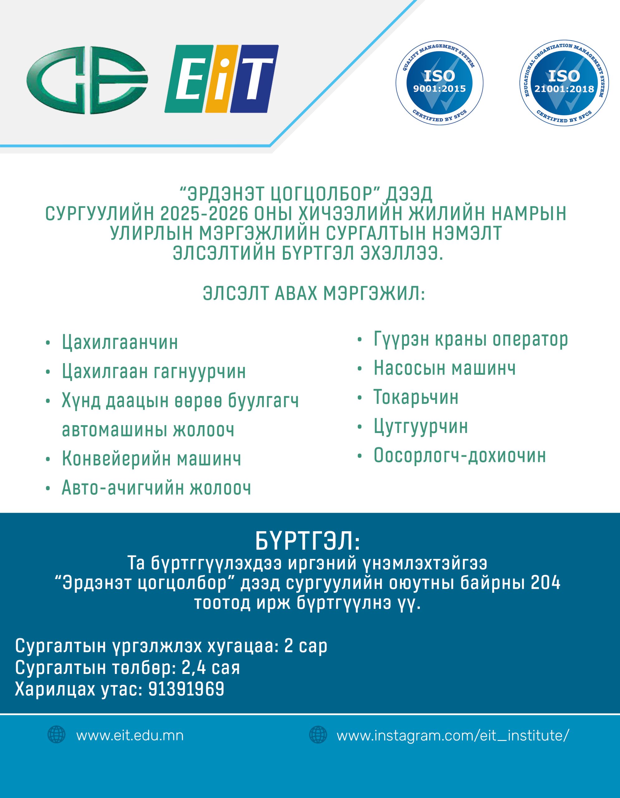 - “ЭРДЭНЭТ ҮЙЛДВЭР” ТӨҮГ-ын нэрэмжит сургалтын төлбөрийн хөнгөлөлт эдэлнэ.