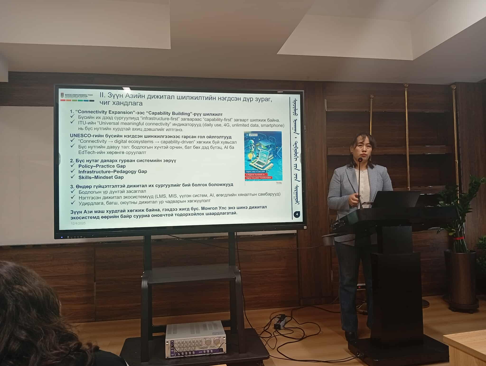 Тухайлбал, Шинжлэх ухаан, технологийн их сургууль-ийн Менежментийн сургуулийн Бизнесийн сургуулийн тэнхимийн дэд профессор М.Бурмаа, Ph.D “Дээд боловсролын байгууллагуудын дижитал шилжилтийн бэлэн байдал: сорилт ба боломж” сэдвээр Азийн орнуудын их, дээд сургуулиудын цахим шилжилтийн харьцуулсан судалгааг танилцуулсан бол “Эрдэнэт цогцолбор” дээд сургуулийн Мэдээллийн технологийн тэнхимийн эрхлэгч А.Түвшинжаргал “Дээд боловсролын салбар дахь цахим шилжилтийн шилдэг туршлага” сэдвээр хэлэлцүүлэг өрнүүлэв